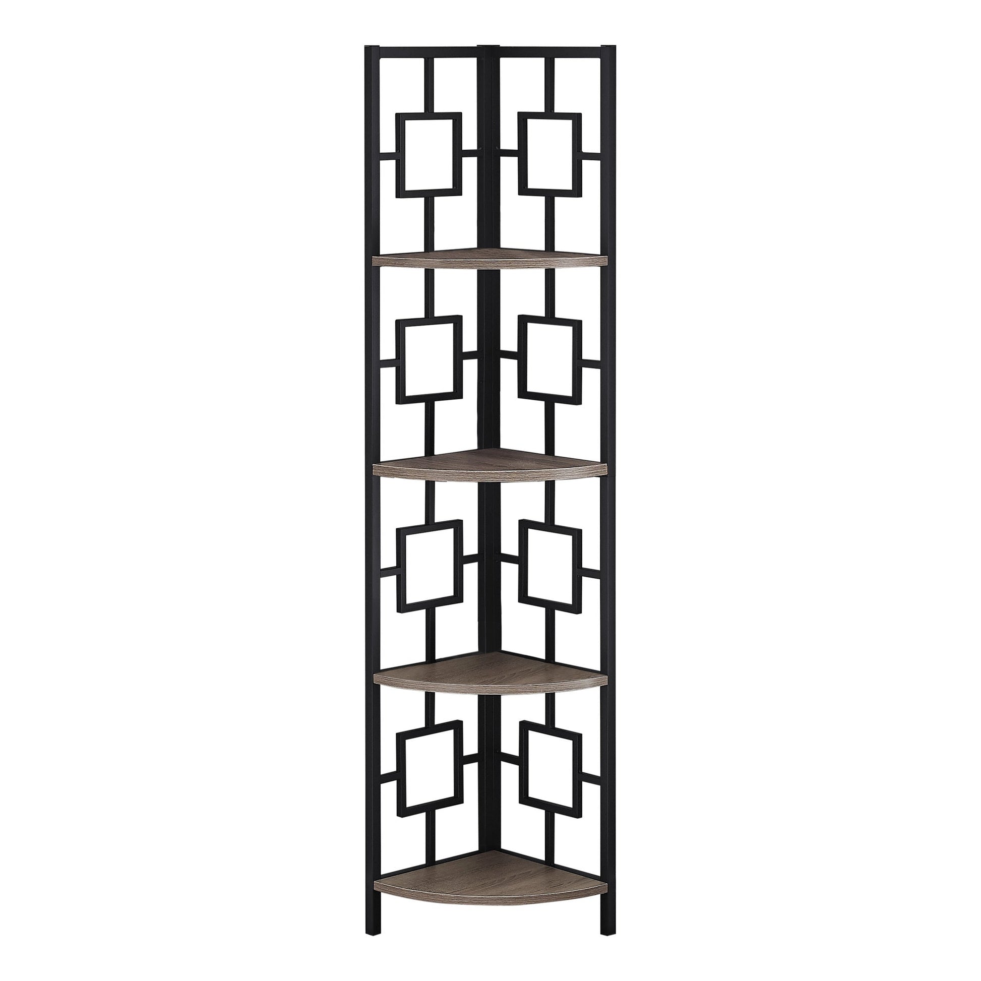 Perfect for photo frames, plants, other decorative items and even kitchen accessories, this transitional-style corner bookcase will upgrade your decor. Including 4 solid dark taupe wood look display shelves, this corner display unit features a three-leg black metal frame and a square transitional design that will add modern flair wherever you choose to place it. This corner etagere bookcase is sure to impress. Assembly is required.